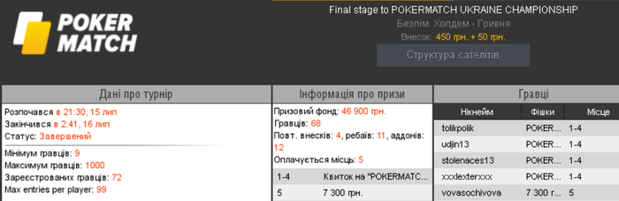 Обращаем внимание игроков, у которых есть 2 и более билета на финальный онлайн-сателлит к PokerMatch Ukraine Championship. Вы не можете использовать билеты для ребаев/адд-она, однако структура финального сателлита предусматривает возможность повторного входа (ре-энтри) в случае вылета в период поздней регистрации. Таким образом, в случае потери всех фишек во время поздней регистрации у вас есть возможность использовать дополнительные билеты для ре-энтри, и избежать дополнительных затрат на ребай.