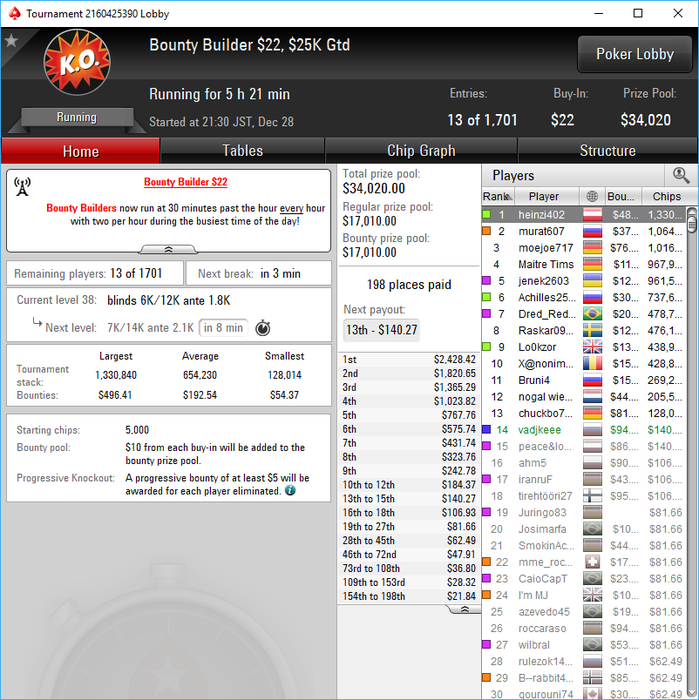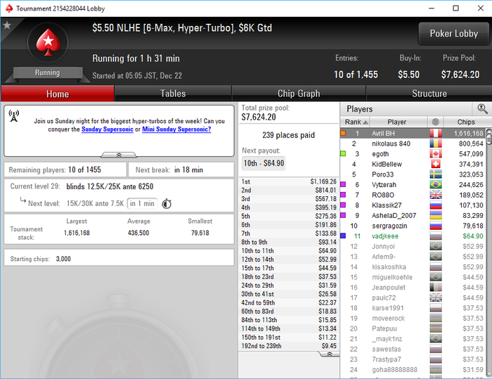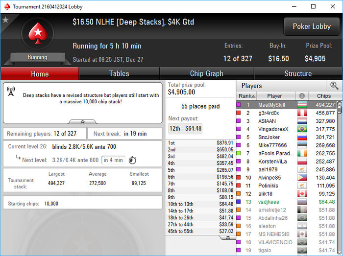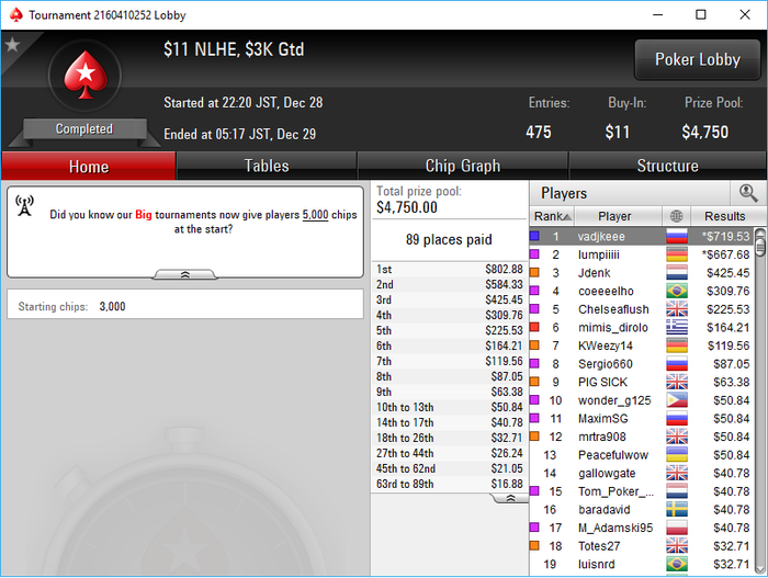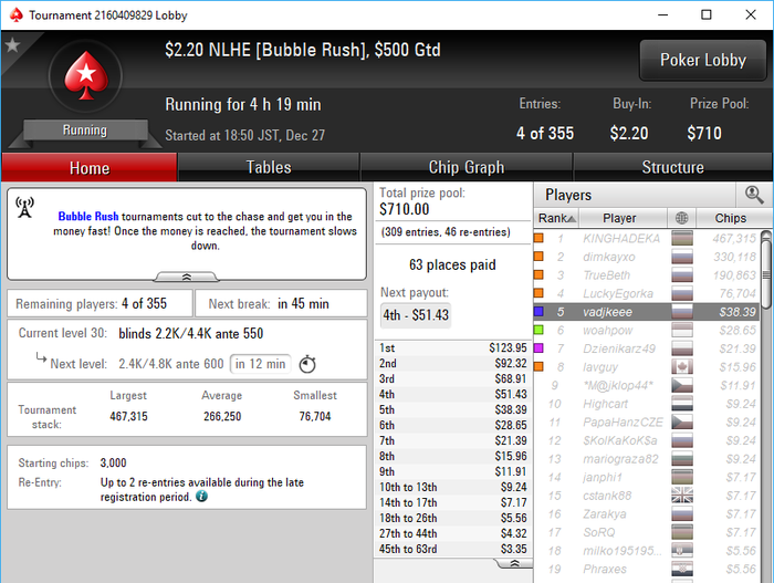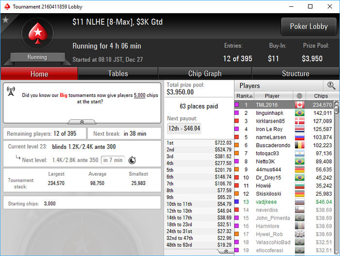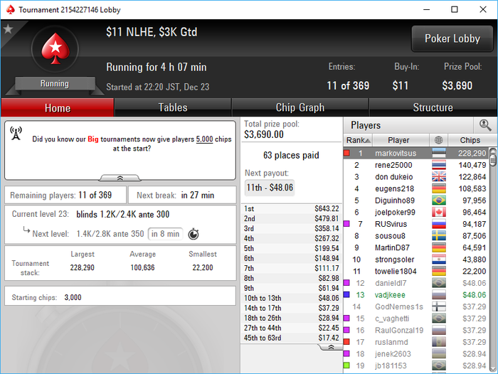 Да как так-то... последняя раздача AKs < 88 состав конечно ппц...только 1 фиш был на финалке. тип который 4 занял мисскликом в 25бб открылся со стэком 50бб....и бразилец это "учуял" в чате поинтересовался и пиханул в него, а этот на последней секунда заколлил с JTs и AJo > JTs выбыл. Для меня это было приятно И кстати это была вторая сессия... Устал как собака
