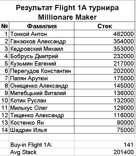Сегодня у нас в программе сразу два флайта на турнир PokerMatch Millionaire Maker. Первый из них (1В) стартует в 13:00, а второй (1С) - в 19:00. Бай-ин - 3500 грн. Кроме того, в 15:00 начнется суперсаттелит на Flight 1C. Бай-ин - 700 грн. Гарантия - 10 билетов по 3500 грн.
