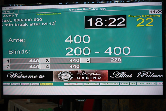 В 16:00 продолжим MAIN EVENT, re-entry по 440уе, с гарантией 40 000уе. Сегодня сыграем 6 уровней, поздняя регистрация весь день В сателлите осталось 10 человек.