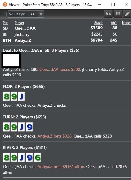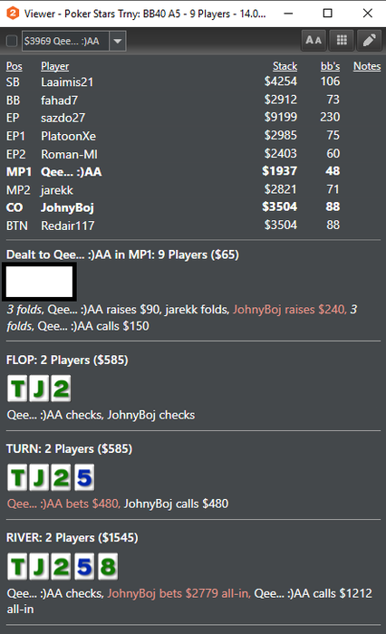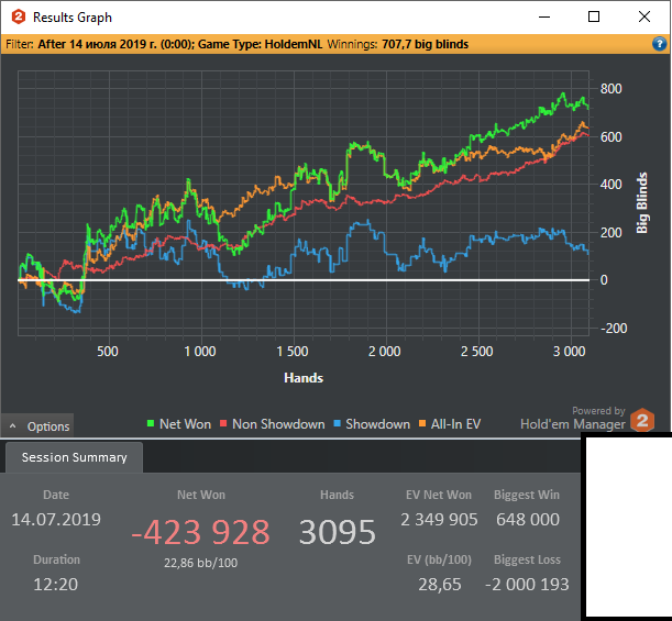 ривер - мы офк чекаем, получаем снеп пуш от оппа. По сути, он изображает только карманные 66ки. У нас рука бьющая все блефы, даже нету бубового туза. Мы там еще блочим ДТ всякие, но это особо не имеет значения ввиду игры на флопе и терне от оппа. Наша линия выглядит просто как кусок говна, тупо нету нихуя, а тк у нас с данным персонажем богатая история, то он явно будет желать отъебать меня. 3-4 секунды подумал и отбил. Сейчас бы в три комбы поверить, когда комб блефов на порядок больше.