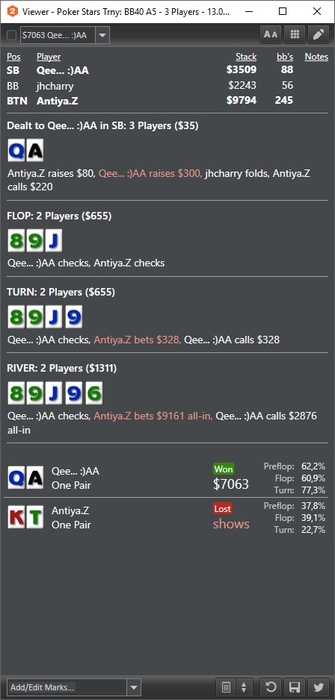 ривер - офк, у нас теперь нет вэльюбета, тк не получим никакой оплаты с рук слабее, подавляющий процент не крестовых риверов я бы пихал сам. Но тут мы получаем пуш спустя 10-15 секунд раздумий. Я извел весь таймбанк, но так и не понял, сложив всю картину от пре до ривера, с какой рукой так можно сыграть на вэлью, - а значит, коллпоказывай. Достаточно интересный ШД, имеющий смысл в чек беке по флопу на самом деле, тк у меня явно будет перевес огромный по эквити против КДс не в масть флопа на таком борде в таких позах в трибет банке. Основная проблема в том, что все оверы, имеющие фд по флопу, обязаны меня вгружать. Да даже АКс тут сложно почекать.
