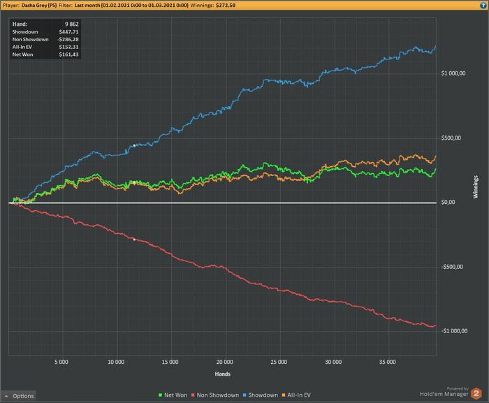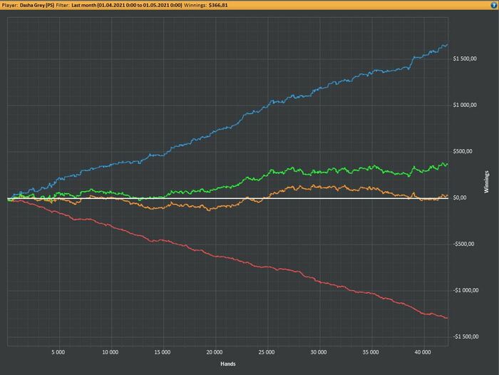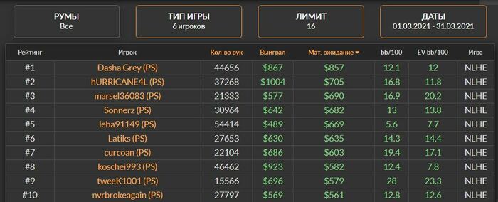 Вроде жизнь налаживается. Нашёл сразу двух напарников. Совместный разбор раздач дал довольно большой эффект. Играл в марте очень много (240 часов). Результатом доволен.