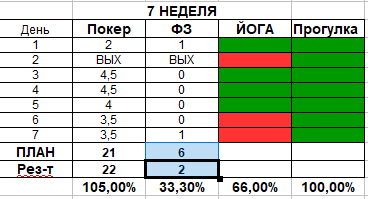 Цели на 8 неделю: покер/йога каждый день, покер 4 часа и ФЗ 1 час с 1 выходным. Режим дня уже сменить! Короче всем удачи