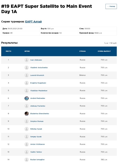 К концу второго уровня сделано 60 входов в Главное событие EAPT-Алтай, два из них принадлежат Сергею Хохлову. Для любителей сравнений скажу, что на предыдущей алтайской серии первый флайта Мэйна собрал 65 регистраций, а все дни суммарно - 252. Позитивное начало.