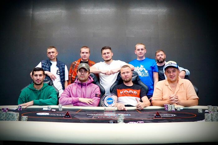 Начинавший финальный стол чиплидером Евгений Катымаев не смог подняться выше седьмого места. Оставшись с 200 000 фишек, он поставил олл-ин с баттона на . Евгений Шикунов на SB зарепушил на .
