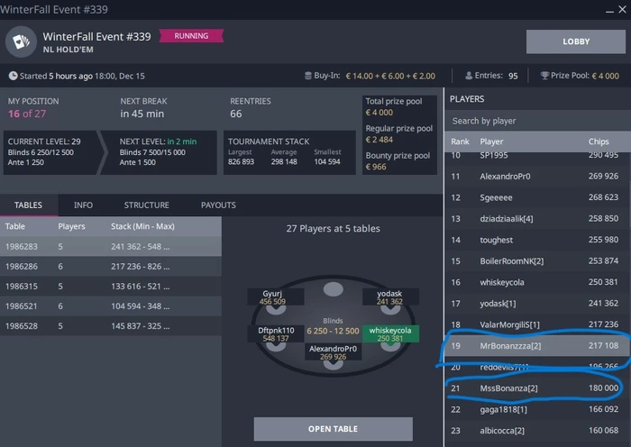 dru-hemmul, 2500 вывел после перезапуска....они провалились в серии ..и турнире 100 тысячнике...там их бот выиграл...и оверлей был 75тыс..вроде такие цифры..а потом пошли проблемы с выводами ....их боты за 10 мин....написанные для 9max....а игра 6 max видеться...тогда очевидно стало что хер выведешь...