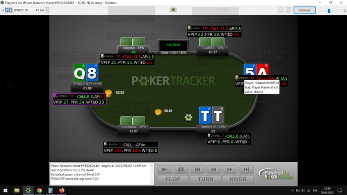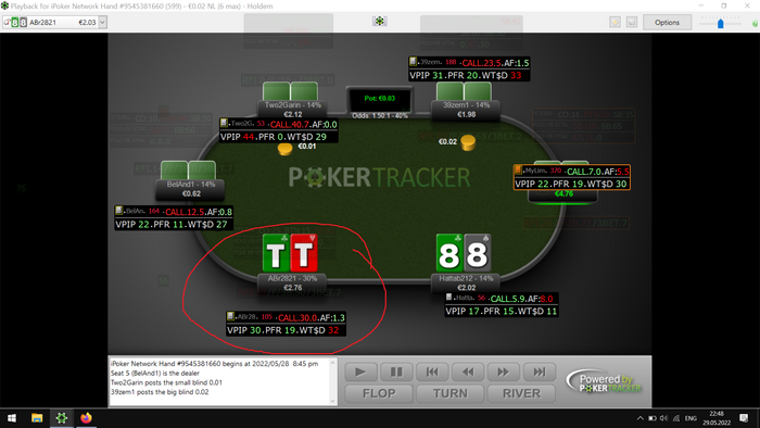 CO shows (Two Pair, Tens and Sevens) (Pre 82%, Flop 89%, Turn 95%) BTN shows (Two Pair, Nines and Sevens) (Pre 18%, Flop 11%, Turn 5%) CO wins €4.05 Rake paid €0.28
