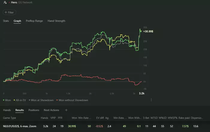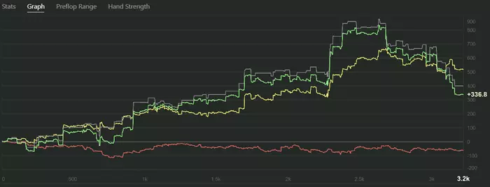 На 888 на 60к+ рук вышло 36, что вроде бы замечательно, но говорит что я упускаю много около нулевых ситуаций и сдаюсь как нит префлоп, постфлоп.