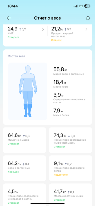 15 июля бицепс был 37 см, сейчас он 39,5 см. Весы неправильно считают процент жира, но мне важна динамика изменений: