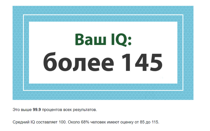 Попробовал пройти сокращённый тест на IQ (25 вопросов). Результат показал: "Больше 145". Не в службу, а в дружбу: этот тест простой и поверхностный или реально упрощённая версия? Помогите разобраться. Ссылка.