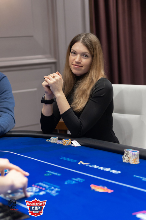 На доске: Колотюк и Белоусов чекали до шоудауна. Банк уехал к Ксении. У нее около 70,000 фишек. У Белоусова - 33,000. Чемпион High Roller этой серии Дмитрий Атаков покинул Main Event.