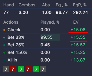 На скриншоте видим, что солвер в этой ситуации 77 никогда не чекает. И ставит её за 1/3 (как и весь диапазон). И как правило на этом разбор раздачи заканчивается. Сеты это 100% бет, погнали дальше. А вот почему сеты 100% кбеты? "Ты че дебил? Это сильное велью, да ещё и не блочит особо диапазон кола по ТП. + Мы можем ставить с ней довольно часто 3 улицы выходя на АИ" - Ну или примерно такая аргументация будет у большинства. И я с этой аргументацией не буду спорить! Она верна. Сам так играю. Но у меня есть один МАААЛЕНЬКИЙ ВОПРОСИК!