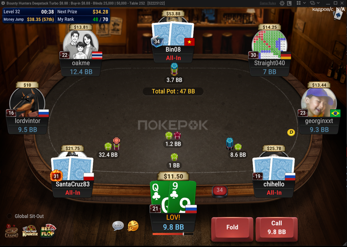 1. Ты выигрываешь всех игроков и выигрываешь 35,1 бб + 2 нока на сумму $79.66 (без 26 центов это равно 9 бай-инам);