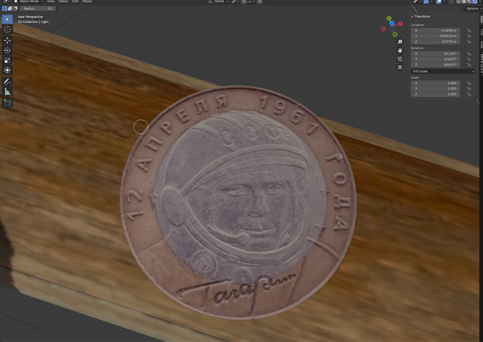 2. Захотелось перенести некоторые простые объекты из реальности в 3д, и одновременно закрепить навык работы в Блендере с текстурами и UV. Плюс было интересно насколько хорошо будут смотреться текстуры сфотканные на обычный андроид телефон. Взял предметы с характерными текстурами: спички, монету с Гагариным и облезлый старый молоток.