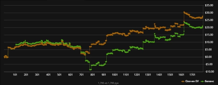 Сегодня ПокерОК отдал за вчера. Но концовкой не очень доволен, мог закончить лучше. Один умник еще выставился со мной на префлопе с 88 против моих АК, ну и результат очевиден. Надо себе поставить какой-то стоп-вин, помимо стоп-лосса. По сути, если игра идет и результат в районе +10 БИ, то можно спокойно заканчивать. Дальше есть риск поймать куллеры, бэдбиты в итоге уйти в тильт и там понеслось уже.