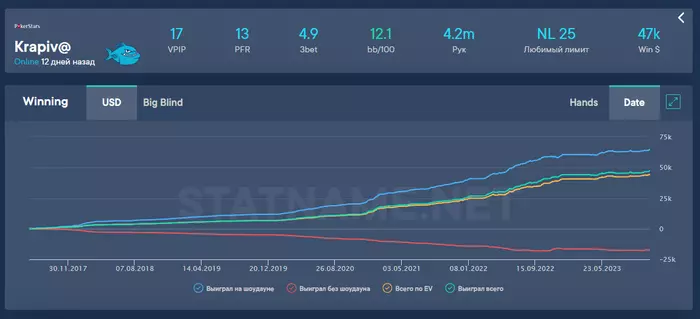 Azi,еще с одним регом на двойке пересекался на покерстарс и у него в вк была группа,где он результатами делился,катал нл2 зум в 16/100,сейчас играет нл10 зум.За пять лет с нл2 до нл10.Как то так.По меткам и на ГГ и на Покерстарс,я вижу наоборот миграцию регов ниже,особенно в зуме.Зум,верноятно стал совсем тяжелым.Был один турок на 2ке,тот пошел катать после 2ки раш200,но опять потом пришел на пл2-5.Может почку продал?