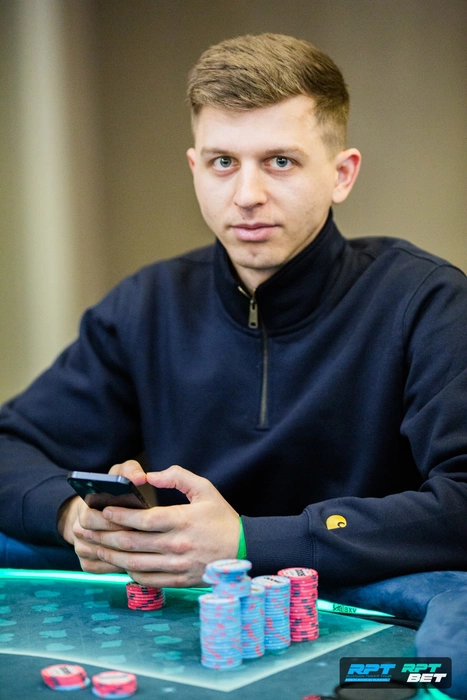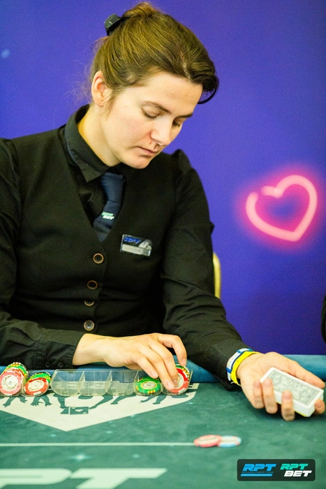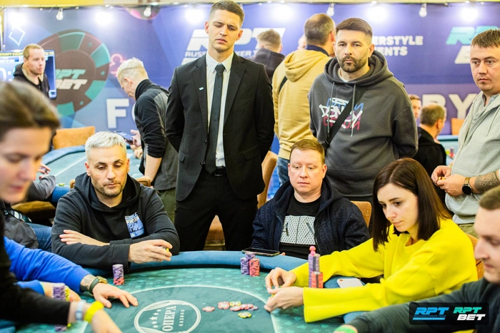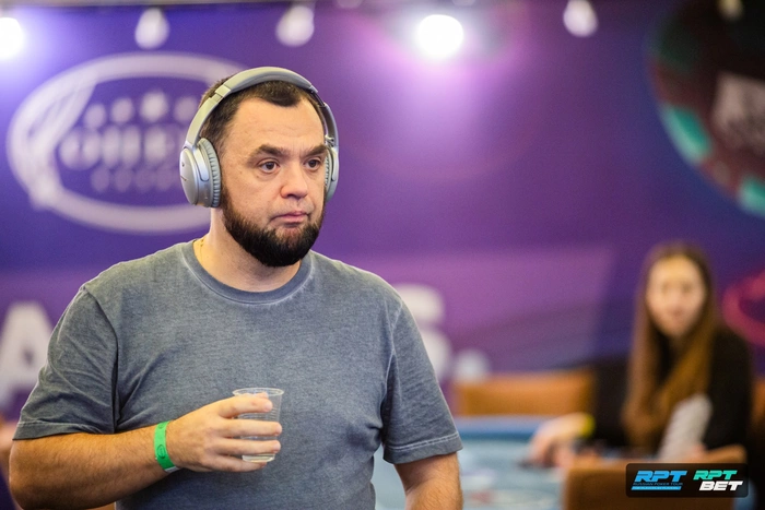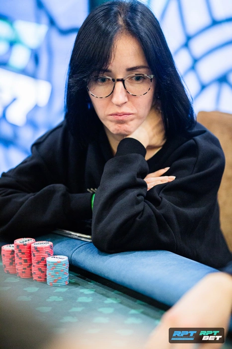Антон Котляр на большом блайнде подбил против открытия Юлии Федоровой. На доске Юлия просто поставила олл-ин в чек. Очень долго думал Котляр, но справился выбросить.