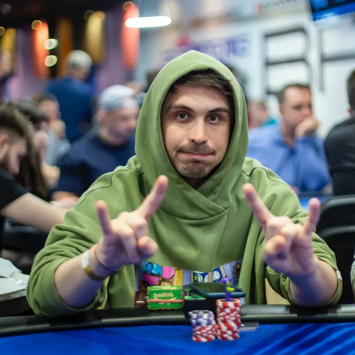 Продолжим игру в финальном дне завтра в 12:00 с топ-18. Как только доиграем до финального стола, переместимся за ТВ-стол. Время старта объявим уже завтра.