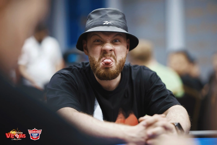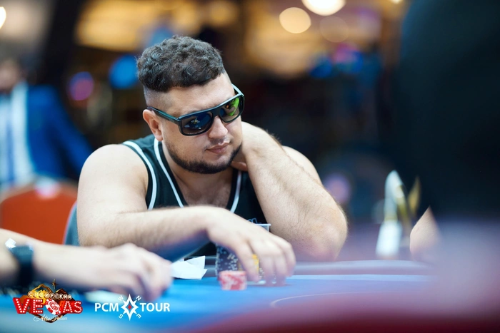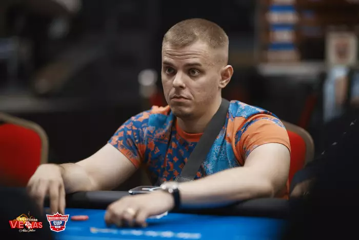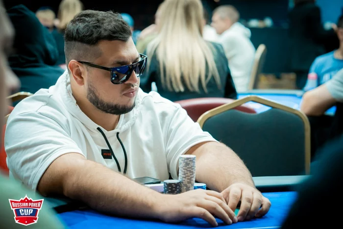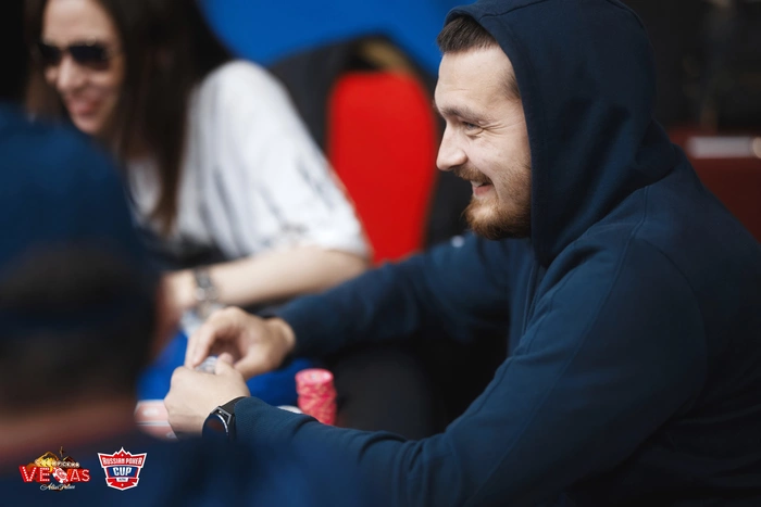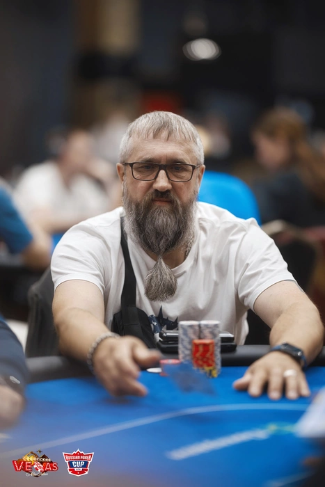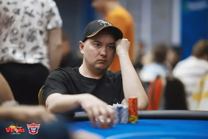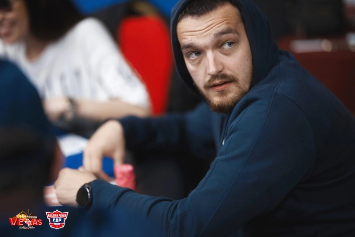 Александр Воропаев (1,075,000) открылся 130,000 с катоффа, Роман Марков (440,000) запушил с малого блайнда. Воропаев (на фото) уравнял с .