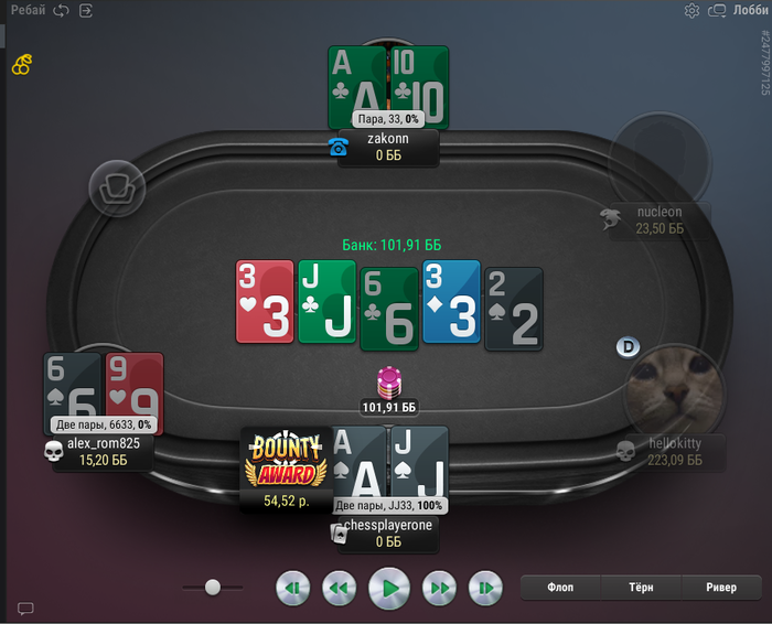 Откатал сессию. Сегодня пришлось чутка отменить некоторые турниры. есть дела которые нужно срочно решить. С тузами когда выставился и увидел карты оппов молниеностно подумал сейчас каждый помает сэт кроме меня😂 Я ванга 😂 В 8.88 обидно конечно, 12 минут до лайт реги, турнир сложно шёл я сильно просел вначале, ничего не раздавали, потом комбэкнул и так размазался. Ладно бывает. Итог сессии небольшой + и то не плохо, с учётом сколько я туриков загрузил. Можно было по лучше, но ГСЧ пока не отдается. До ТОП 🥇 - тоже пока не могу дотянуться, но радует что есть финалочки. А дальше дело техники. Остался 1 турнир на Покер Доме, доиграю его с телефона. Уехал по делам. Всем спасибо кто был на стриме. Удачного всем дня! 💪