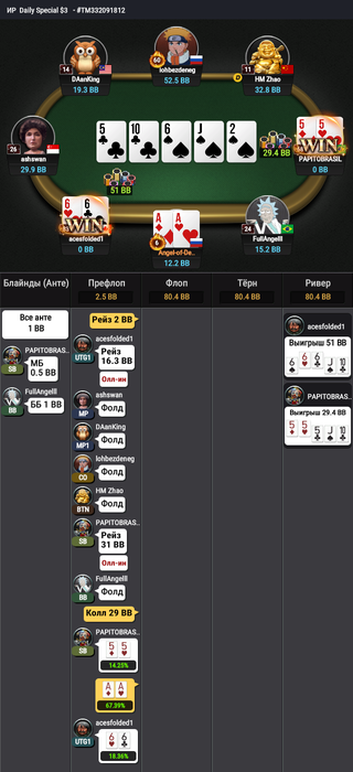 Откатал первую сессию 🦾 Уфф по началу складывалось все не очень, но потом парочку туриниров все исправили. В Т-билдере нереально крутанулся и смог дойти до ХА но там без шансов, в омахе за 11 юаней тайваньский опп сидел со мной на предфиналке и крушил всех подряд, чем и занимался на финалке. Особо не рыпался там все крыло просто по грязи и в 3 макс у него было 150 бб против 60 и 20 соответственно, 1 раз об него качественно удвоился но на второй раз попал в грязь на флопе выставились у меня сэт JJJ у него сэт ККК. Аут. В нок турике сделал все что мог но 2 раза так ужастно упаролся об одного и того же оппа что увы. Первый важный банк я проиграл ему с QQ префлоп выставление 94 на флопе 4 и терн 4, при этом 1 игрок показал 4. Второй раз я запушил в него когда он открылся и упоролся с 99<AA. Я его перекрывал и обязан был лезьть за этот крупный нок. Следом чудом утроился и вышел на финалку. Там увы проиграл в мультипоте префлоп выставление. Результатом для первого дня очень доволен. Сейчас буду заниматься делами.