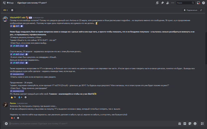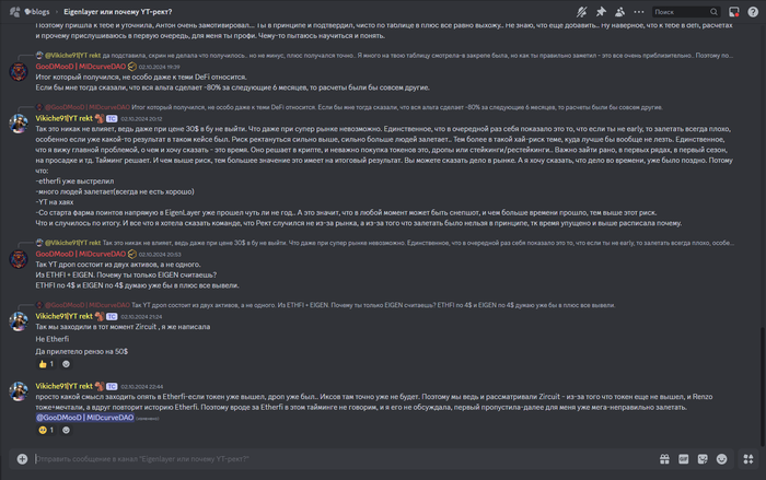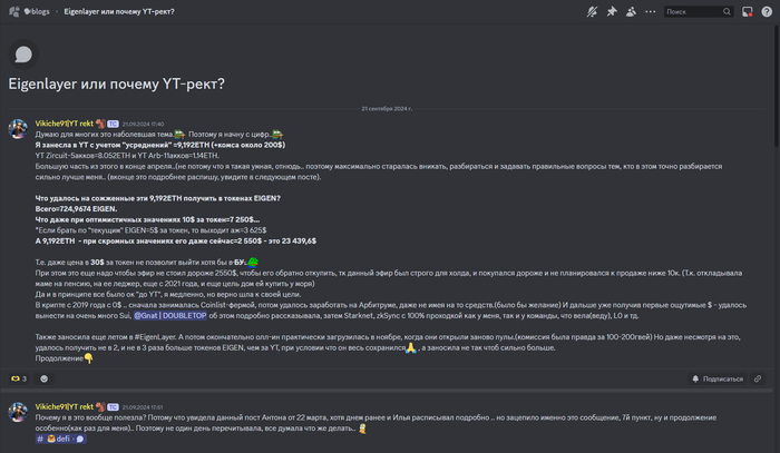 Сам проект Eigen неслабо побрил пользователей YT, выдав токенов где-то раза в 2 меньше (а то и в 3 раза) положеного в первом сезоне, листинг токена перенесли на осень и запустили второй сезон, токены от которого раздали до листинга, тем самым уронив ожидаемый курс в пол, еще и рынок упал.