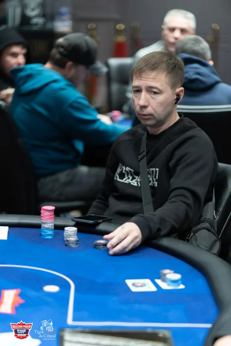 Стол 2. Тут вылетел Максим Кононенко. Начался прямой баббл и синхронные раздачи.