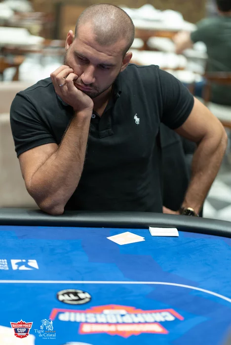 Стол 1. Федор Николаев (250,000) открылся 20,000 с баттона, Роман Ро (213,000) запушил с малого блайнда, Николаев отбил с и устоял. Роман Ро — аут.