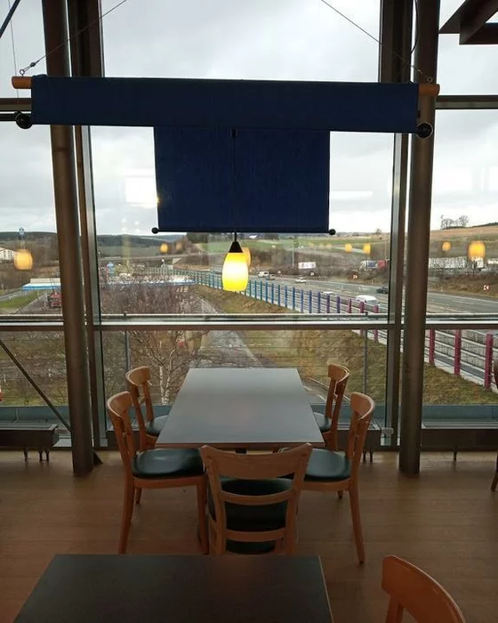 С окон также видна красивая природа Баварии. Но более всего мне нравится сидеть посредине этого моста как раз над автобаном. Сидеть одному (нас двое обычно: мое сердце (она же душа) и мой мозг если что, который постоянно не умолкает мыслями, как движение автомобилей по автобану😉) за уютным столиком у панорамного окна моста-ресторана, что парит над многополосным автобаном, словно стеклянный корабль, зависший в небе. Вокруг — лёгкий шум ресторана, запах свежемолотого кофе и бургера с Макдональдса. Внизу — нескончаемый поток автомобилей, которые превращают топливо в СО2. Одни проносятся мимо стремительно, другие медленно катятся, будто в замедленной съёмке, тяжело взбираясь под гору. Фары, цвета, движение — всё это напоминает реку жизни. Ты смотришь вниз и ощущаешь, как мир живёт, движется, бурлит, а ты — наблюдатель, немного в стороне, чуть выше. Кофе тёплый, ароматный, чашка приятно греет руки. Ты отпиваешь глоток и задумываешься — о людях в этих машинах, куда они едут, что чувствуют. Всё кажется немного нереальным, будто ты внутри картины: линии автополос, плавный изгиб автобана, стеклянные стены, отражающие небо и свет. Это романтика движения и покоя одновременно. Мир спешит, а ты — остановился и забыл о боли, потерях и заботах. И в этом мгновении — удивительное спокойствие и вкус самой жизни! Немцы умеют создавать особенное.