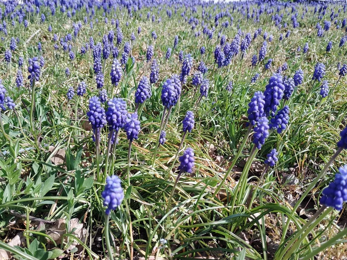 Внизу дуба синеет огромная поляна мускарей. Очень красиво.