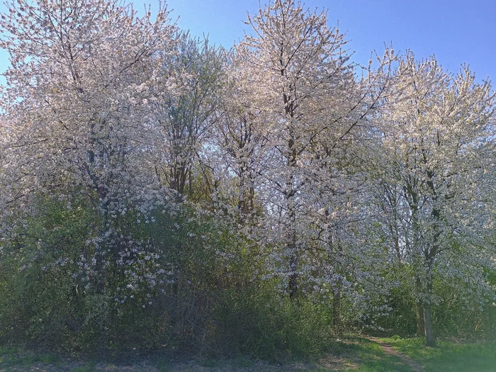 Очень красиво, не правда ли? И эта природная красота всегда - в любое время года и погоды! Красота разная, изменчивая как настроение у женщины и у покерного игрока :). Сейчас весна и все цветет. Вот эти три высоких диких черешни (на немеком Vogelkirche - птичья вишня, подруга Vogelmann'a 😁) так зацвели, как-будто собрались под венец в своих белоснежных нарядах (неужели тот старый и черный дуб из "Войны и Мира" будет одной из них женихом, а может он после зимней спячки осилит всех троих блондинок сразу? 😉).