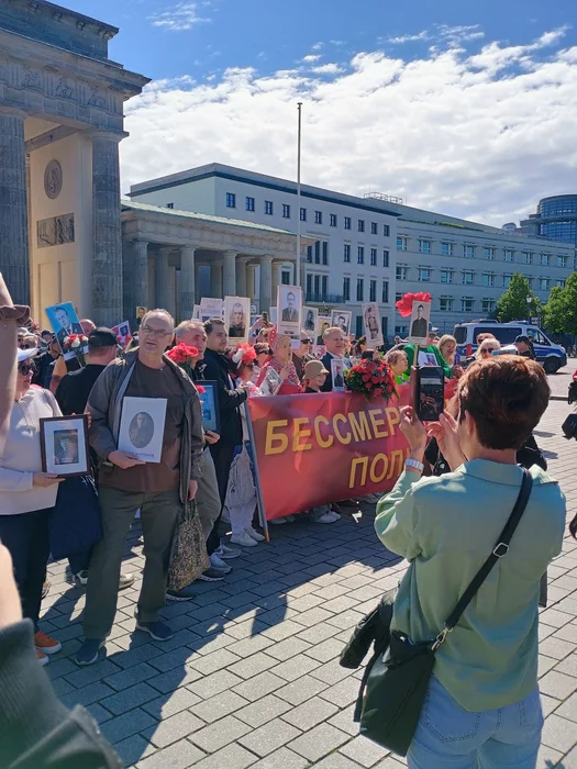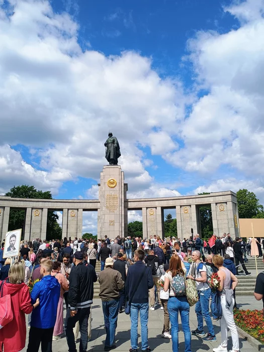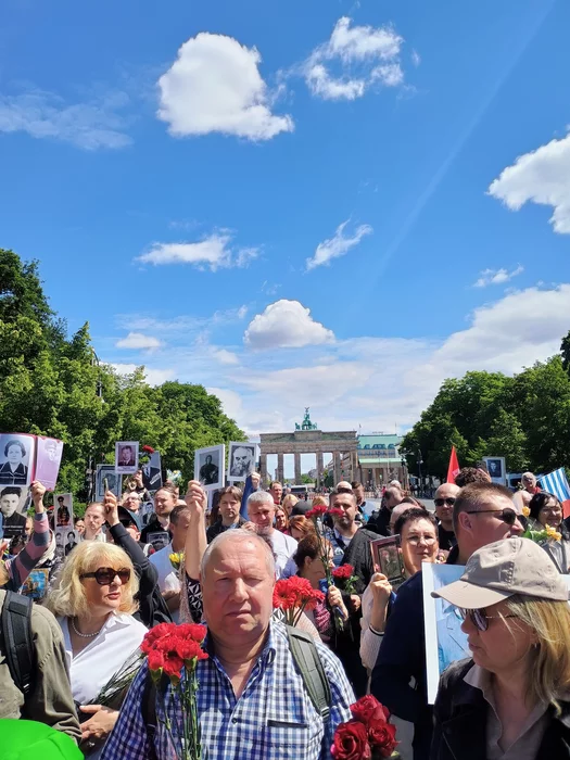 Приехал 9 мая, утром и как-будто я попал в один из районов Турции, а не в Германию! Увидеть чистокровного немца в Берлине задача ещё та, наверное! В этот день (День Победы!) возле Бранденбургских Ворот было разрешено провести акцию Бессмертный полк, в котором я тоже принял участие. Я так соскучился за этим праздником, последние несколько лет в Украине за то, что вывесил бы Знамя Победы или включил песни про войну, можно было бы схлопотать "админку", а то и уголовку. Люди боялись это делать, а те кто отдал жизнь за мирное небо своим внукам уже не могли заново отвоевать свое право на свободу. Поэтому, поскольку я не взял в руки оружие, решил почтить память своего деда и бабушки жены, пронеся их портреты в Бессмертном полку в Берлине. Чувство непередаваемое - как-будто я окунулся в тот май 1945-го! Не обошлось и без эксцессов, но в целом все прошло в рамках закона и мирно. Собрались не только русскоязычные, а были и поляки, итальянцы и немцы - все, чьи родственники тогда сражались.