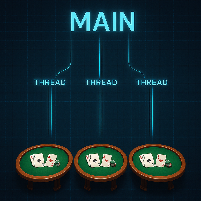 Main поток — это турнир как единое целое, вновь организованная система, которая стремится к своему завершению (ничто не вечно в нашей жизни, даже Солнце и то когда-то поглотит Землю 😢). Он организует всё: регистрирует игроков, открывает столы, следит за временем, правилами, этапами. Он — как всевидящее око: не участвует в действиях напрямую, но запускает каждый стол и ждёт, пока каждый из них завершит свою игру.