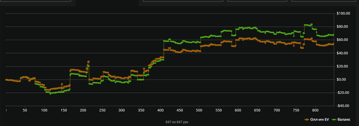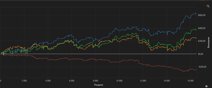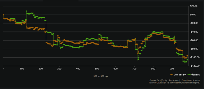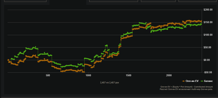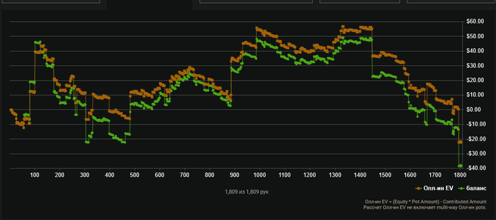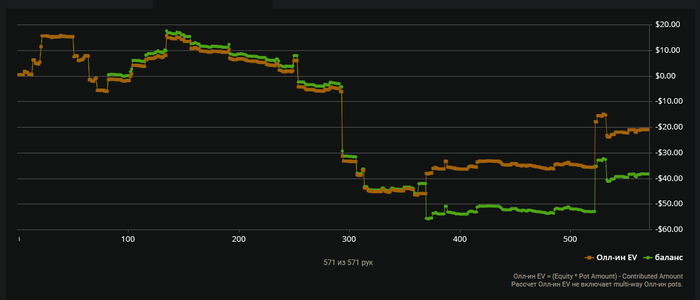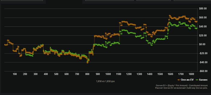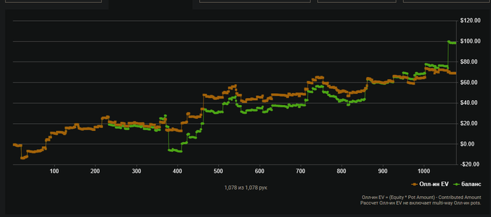 Привет всем!Все таки буду выкладывать бессмысленные графики с покерка,чтобы колличество рук показывать.По кассе +45$.Рейка заплатил ппц конечно.Но по кассе плюс,так что пох.Фишей море было.