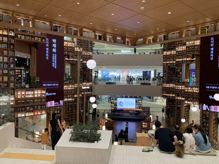 Вчера ездили в торговый центр Starfield в город Сувон. Прикольная библиотека на 4 этажа там со скамейками.Красиво сделали