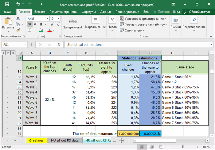 Какие шансы получить 10 таких отклонений от 32,4% на одной и той же дистанции - если простым языком, это 21,5% * 58,4% (см. данные волны №2) * 47,0% * 15,8% * 8,5% * 48,0% * 10,0% * 26,3% * 20,2% * 8,7% = 0,000018% или один раз на 5 000 000 сдач по 500 флопов. То есть - такой статистический ад (столь сильное отклонение (дисперсия) частоты попадания во флоп соперником на дистанции в 500 флопов) происхоит один раз в 2,5 миллиарда раздач (5 000 000 * 500).