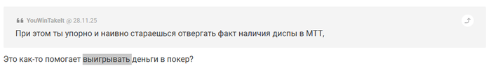 Что касается заострения внимания на твоей наивности, то это уж никак не пересекается с моим покерным путем, я достаточно давно зарабатываю на жизнь покером, это было скорее попыткой вразумить тебя.