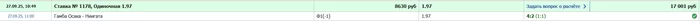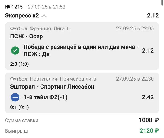 Результаты за вчера 27.09.25. 28 Экспрессов проиграло, 2 выиграло, банк увеличился на 2142 р, итого 186 502 р,+86,5%, 6 экспрессов в разгоне на сегодня с прошлого дня!