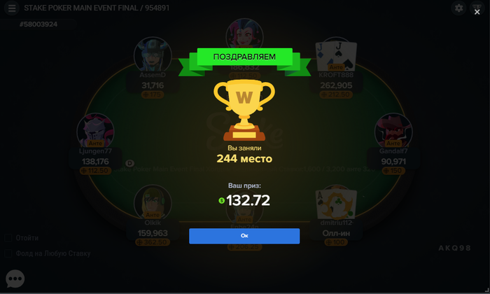 Сегодня будет возможно самый важный турнир в моей жизни- финал мейна на стейке, гарантия 200к. Играют 316 человек, как понимаю, все уже в деньгах, у меня стек ниже среднего, но все еще 30бб, можно бороться. Поле состоит из участников фрироллов чуть менее чем полностью, полагаю, что даже со своим достаточно средним уровнем игры я имею преимущество. Но к сожалению, это преимущество не распространяется на игру в алынах.