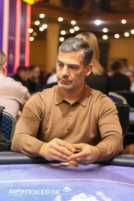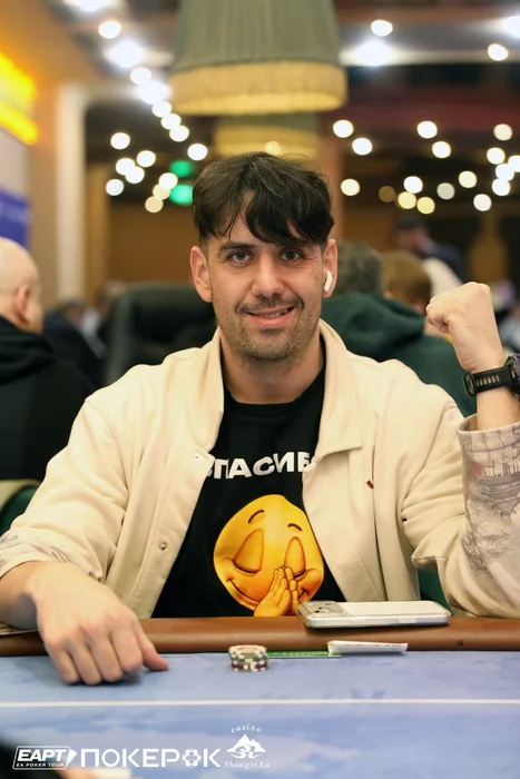 Стол 14. Evgenii Skudnov в последней раздаче перед перерывом выиграл большой 3-бет пот у Vardan Shahatuni. Skudnov (SB) поставил олл-ин на ривере: . Вардан (BTN) долго думал и выбросил, Евгений его похвалил за пас, но карты не показал.