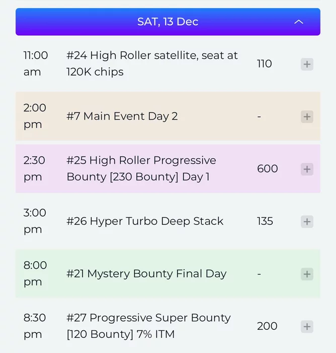 Saturday kicks off with Main Event Day 2, the debut of High Roller Progressive Bounty, Hyper Turbo, and Mystery Bounty Final — the festival's peak!