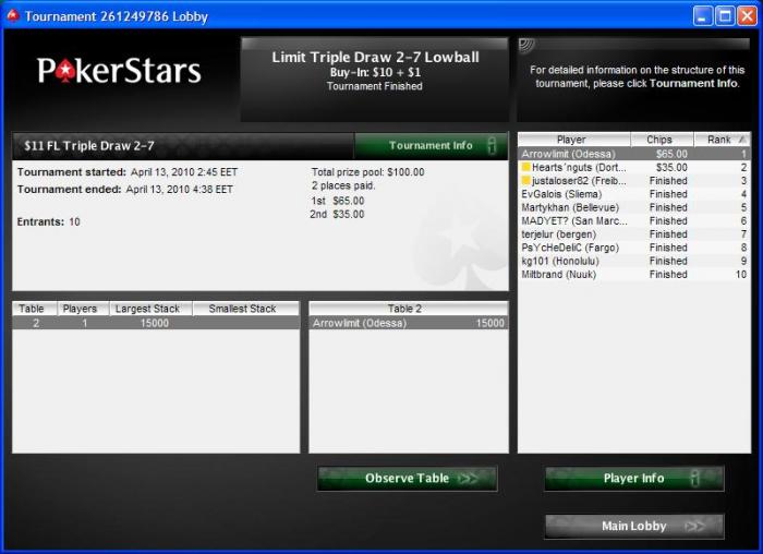 Крошечный занос, но очень ценный для меня тем, что выиграл турнир по любимой игре 2-7 3Draw, в которую в последнее время в рамках 8-Game кэша дела катастрофически не складываются (хотя, все же, думается, трипл дро одна из моих сильных сторон в mixed).