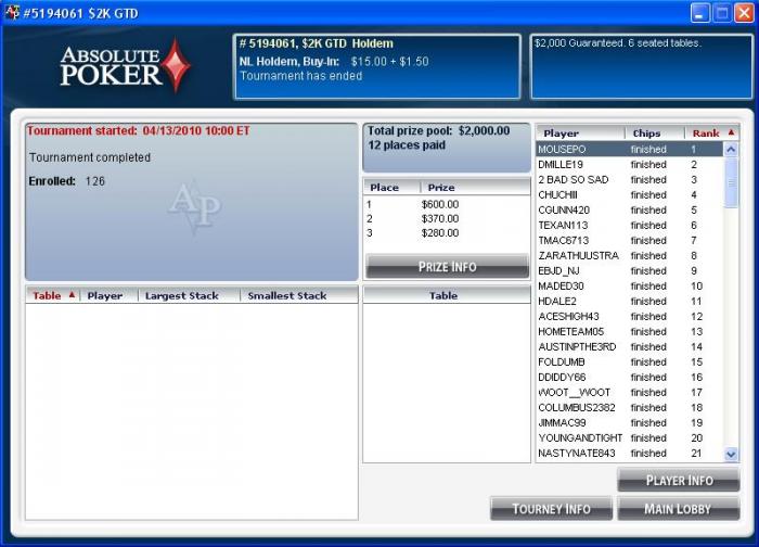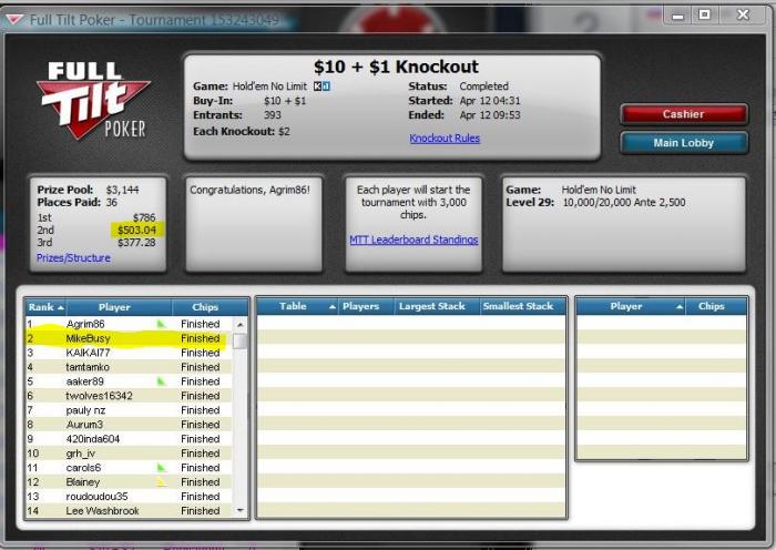 Ну вот могу тоже отметиться... 5.5 часов, куча нервов, огромная поддержка Sliva80 и, особенно, Паксика... Жаль, топ1 не вышел, победитель - мегасуперагроманьяк. Например, он закрыл мой ОИ на финалке почти на весь свой стек с 9Ts. FE с ним никакого, а в ХА ну вообще ничего не заходило!!
