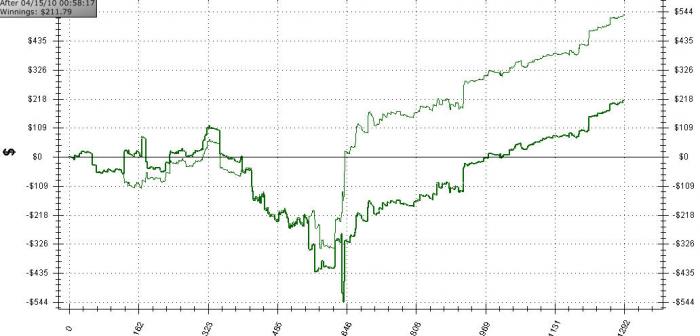Какая-то резня случилась у меня с Джигги или как его там... По лаку улетел в минус 8 байинов, сейчас уже минус 5 сперва проигрывал -500$ (мама!) сейчас уже -160$ (жаль, интернет отключился). Одно утешение - рейк набил за два часа как за сутки, благо играли 7 стеков за столом (и все мои-)