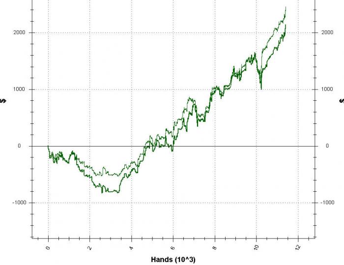 Игрок, выигрывающий около 5.75 PTBB/100, имеет 23% вероятность остаться в нуле после 10k рук. После 2,63 млн. рук можно сказать с 95% уверенностью о винрейте В практическом смысле это означает, что играть в HU наличными с винрерйтом 5 PTBB или меньше совершенно не стоит.