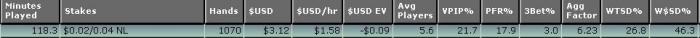 Это было очень интересно! Великолепно! 6 столов SH - это именно то, что мне нужно! Я начал с ними легко справляться. В сравнении со вчерашним вечером, я успевал думать на каждом столе, принимать зачастую довольно неплохие решения. Я получал от этого огромное удовольствие Мне нравилось играть лучше тех людей, которые проигрывали мне деньги! Может это алчность? Хм... Думаю - нет! Просто я люблю успех, который заслужил Сессия была очень насыщенной, играл сначала 4 стола, открыл их чтобы настроить статистику и поиграть по ней. Раньше я также играл с статистикой, но в ней было мало статов, сейчас я добавил ещё некоторые статы, стало гораздо комфортнее. Затем открыл ещё 2 стола и продолжил игру уже на 6 столах. Оказалось, это не намного сложнее 4-х столов, зато намного интереснее и, судя по всему, выгоднее. В результате: