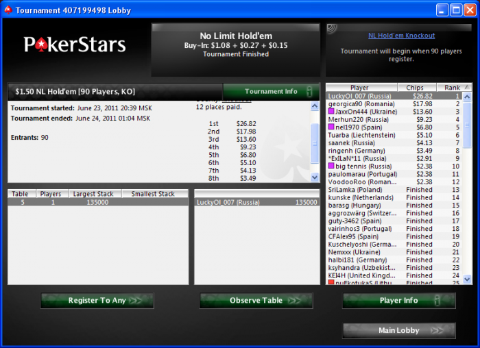 Думал, отыгрывать по 20+ турниров в день. Но вряд ли получится. Сегодня я начал в 18-00, сейчас по МСК 1-00 ночи. Невозможность эта связана с моим неторопливым стилем игры, турниры достаточно плавные, а у меня редко стек превышает или даже равен среднему. Потом на предфиналке распихиваюсь удачно. А до предфиналки игры 2 часа.