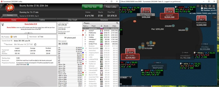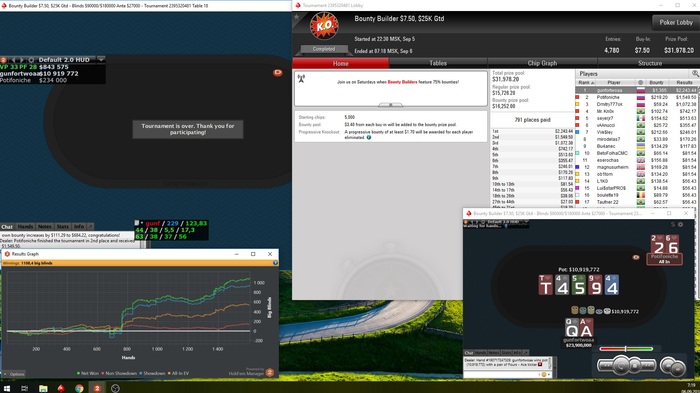 второго прошел... вообще забавный персонаж: начал с ситаута, я съел у него стек до 20бб, 9к1 перевес был, дважды уравнивались до стартового, но продавил его...