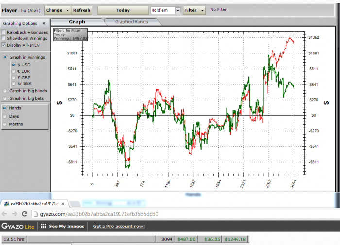 Стремительно проиграл 4500$ в первый полноценный игровой день. Играл ок, ошибался чуть больше обычного. Просто на ШД весь минус и чутка недоборчик. Плохо то что я планировал что бы втянуться начать с лимитов ниже, а в итоге играл даже чуть дороже обычного с не самыми слабыми соперниками. глупо.